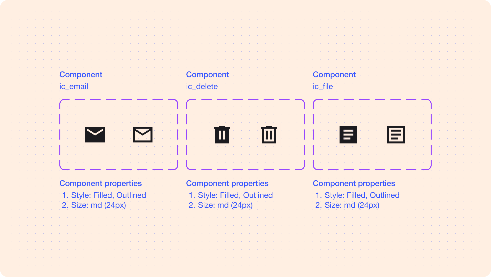 In the following example we have put three different icon components: ic_email, ic_delete and ic_file. To each of these components we add two different properties (Style and Size) with two values for the Style property: Filled and Outlined and a single value for the Size property: md (24px).