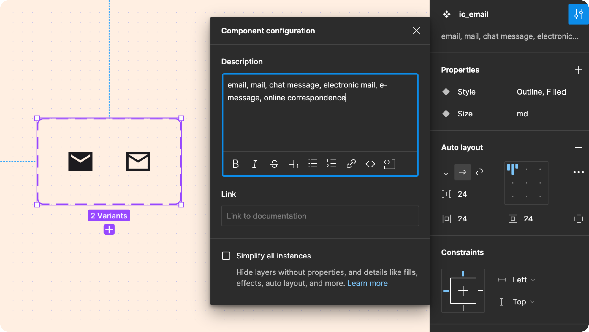 We can now add descriptions to our parts with Figma's recent updates. This is helpful for putting different keywords on the same icon to make it easier to find. For example, we can add keywords such as mail or chat message to the email icon. This way it will be much easier to locate.