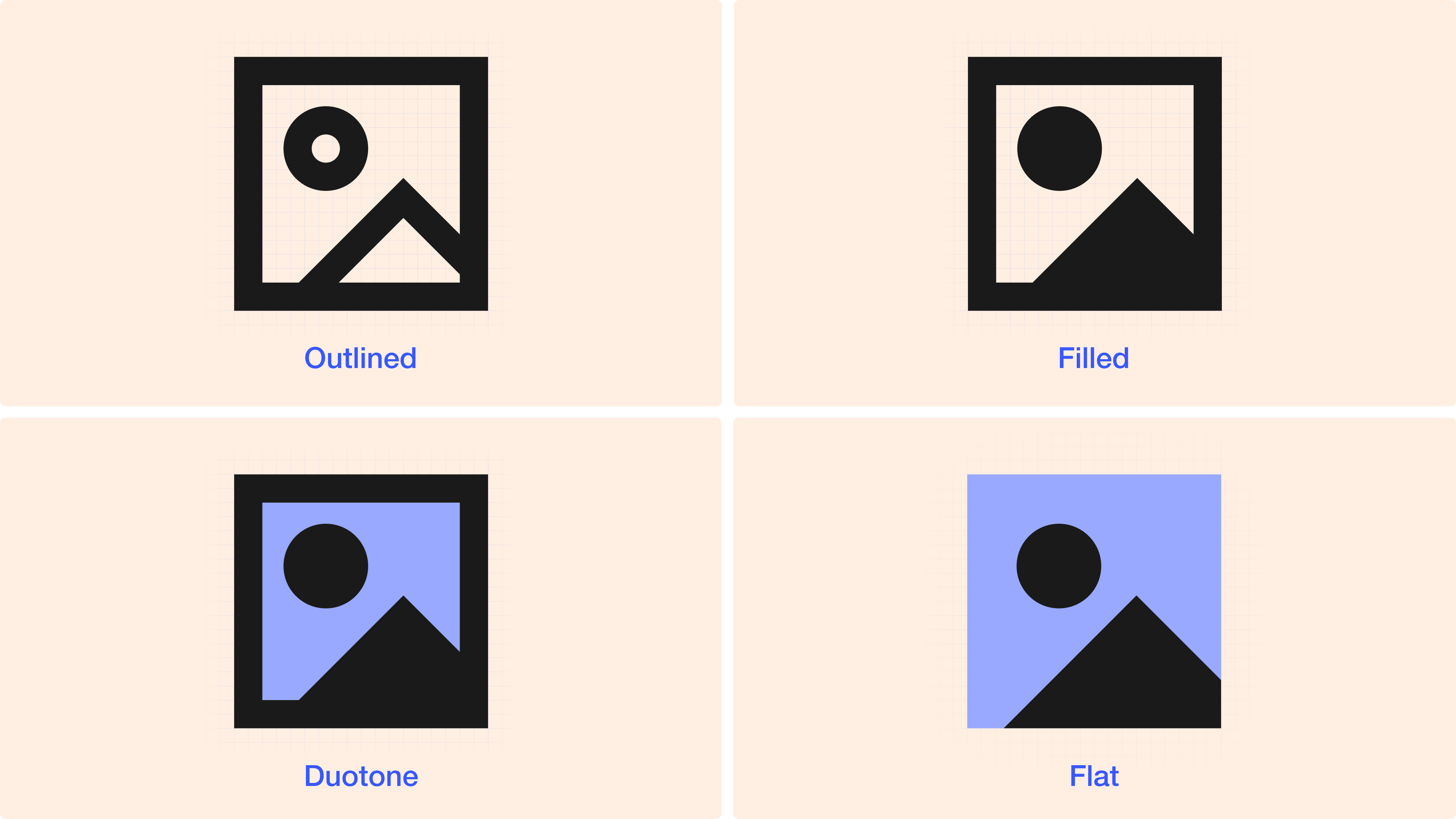 Style is the hardest property to define and can be confusing when trying to figure out what an icon is. For this classification, we wanted to exclude the small illustrations that some design systems include as part of their icon library. This way, our style classification only considers the border or fill properties, and it would look like this: